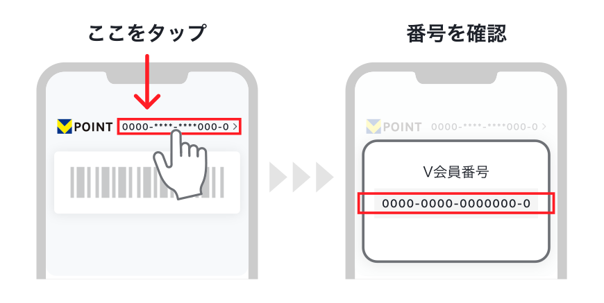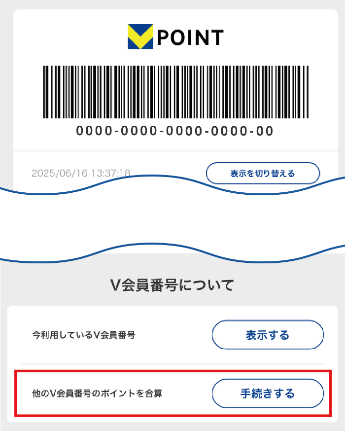 モバイルVカード右上のV会員番号をタップし、「ポイントおまとめ手続き」からお手続きください。